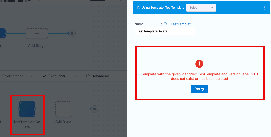 As an example, if a template is being referenced and it is forcefully deleted, pipeline users will see this type of error message in their pipeline.